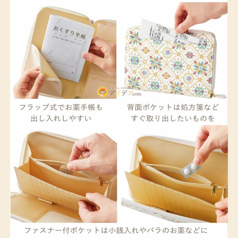 | ■ポケット数 | カードポケット11 お薬手帳ホルダー1 マチ付きポケット2 ファスナー付きポケット1 背面ポケット1 ペンホルダー1 | ||