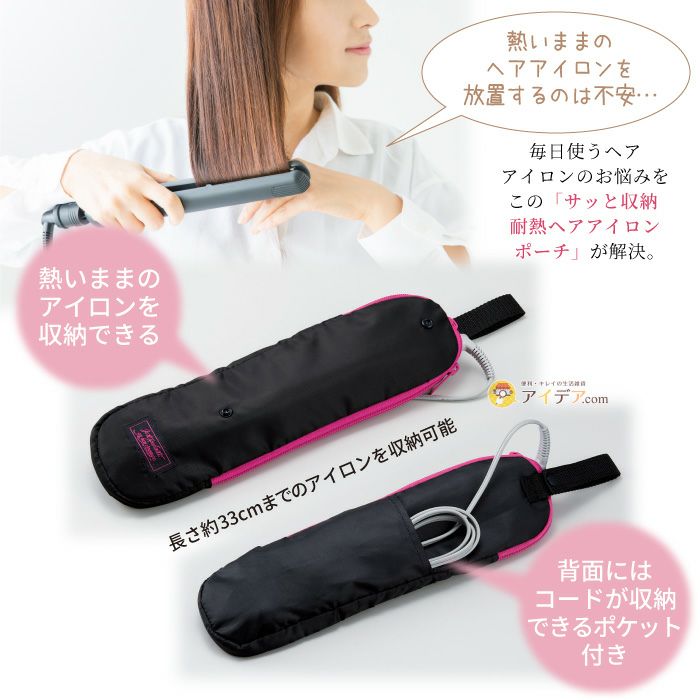 | 熱いヘアアイロンをそのまま収納OK! サッと収納 耐熱ヘアアイロンポーチ ![]() 見つけた瞬間、「こんなの欲しかった!」と飛びつく方が多いのが、こちらの【サッと収納耐熱ヘアアイロンポーチ】。熱いヘアアイロンをそのまま収納できるポーチなので、忙しい朝や旅行にピッタリなんです♪ 内側は耐熱素材使用しているので、熱いままのアイロンを入れても安全なんです。それに背面にはコードが収納できるポケット付き!これがまた便利なんですよ☆ ![]() ![]() ![]() ![]() ![]() ![]() 忙しい朝やトラベルに!熱いヘアアイロンも収納できるポーチ! 220度まで耐熱可能。折り返せば小型ヘアアイロンの収納にも対応して2WAYでも使える♪ 高温のヘアアイロンを収納して洗面台もスッキリ!しかも安全なのが嬉しい♪ コンパクトサイズなので旅行に持っていくのもかさばりません。とっても便利な【サッと収納耐熱ヘアアイロンポーチ】、ちょっとしたプレゼントにも喜ばれますよ♪♪ ご注意)コチラの商品は、ヘアアイロンのポーチです。ヘアアイロンは別途ご購入下さい。 |