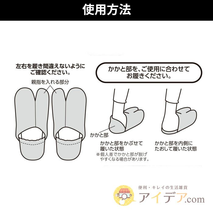 | ■使用上のご注意 | ●本品は室内履き専用のため、室外及び無理な履き方はお控えください。●左右お間違えないようにご使用ください。●色や柄の出方は商品により異なります。●階段や段差のある場所や水に濡れた場所、滑りやすい場所でのご使用はお避けください。●ケガをする恐れがありますので、使用中に走ったり跳んだりしないでください。●長時間水に浸けたままにしないでください。●水や汗などにより湿った状態で強く擦ると他のものに色移りする恐れがあります。万一色移りした場合は早めに洗濯してください。●洗濯機の手洗いモードでは洗えません。●本品は洗濯により収縮する恐れがありますので形を整え陰干ししてください。●破損・変形の原因となりますので無理に曲げたり折ったり、湾曲した状態にしないでください。●袋から取り出す際に臭いが気になる場合は、日陰で風に十分さらしてからご使用ください。●日光や蛍光灯に長時間あてると変色する恐れがあります。●直射日光または高温多湿の場所でのご使用はお避けください。●小さなお子さまのご使用はお避けください。●火気に近づけないでください。●本来の用途以外には使用しないでください。●使用感には個人差があります。 | ||