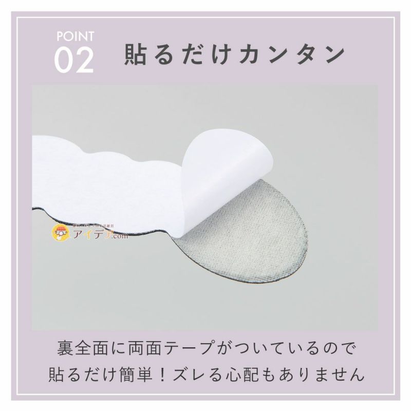 | ■使用上のご注意 | ●靴のデザインや材質によって、使用できない場合があります。●サイズの小さい靴には使用しないでください。●お肌に異常のあるときや異常を感じたときは使用しないでください。●使用状況により両面テープがはがれにくくなる場合があります。はがれにくい場合はドライヤーなどで軽く温めてから慎重にはがしてください。無理に引っ張ると靴の内側がはがれる場合があります。また、靴の内側にベタつきや本品の跡が残る場合があります。●一度はがしたものは繰り返し使えません。●長期間、靴をはかずに収納する場合は、本品を取り外してください。●本品は洗濯できません。●直射日光を避け、湿気の少ない所で保管してください。●お子さまの手の届かない所に保管してください。●使用感には個人差があります。●火気厳禁。 | ||