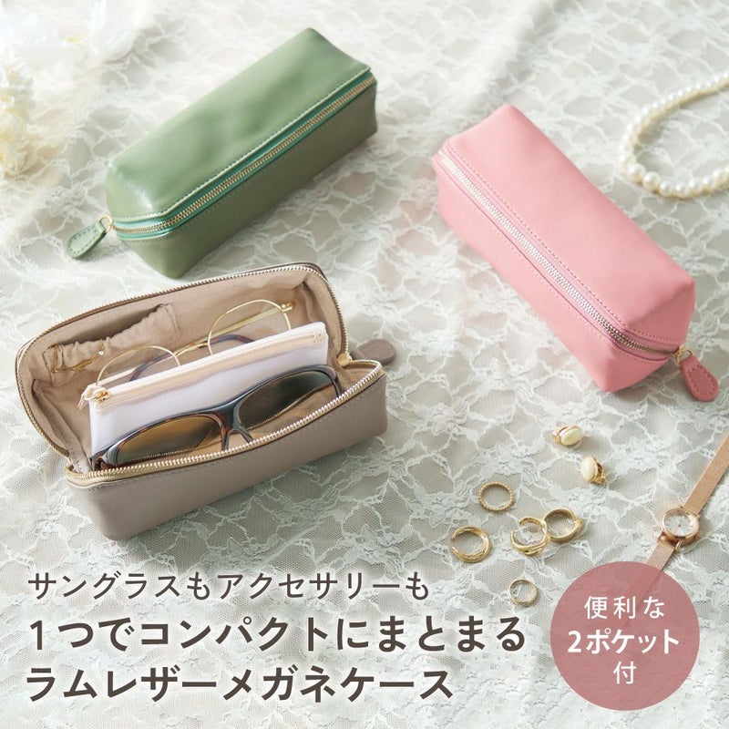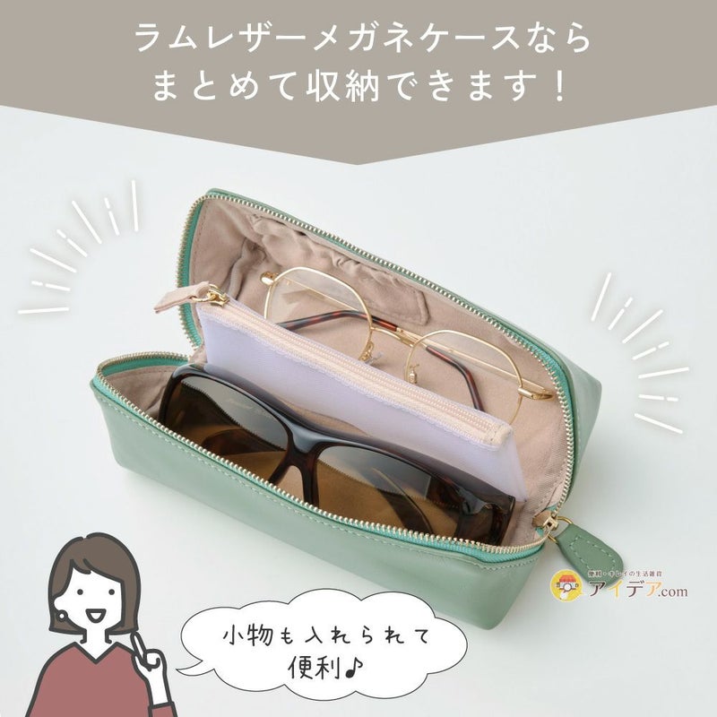 | サングラスもアクセサリーも1つでコンパクトにまとまるメガネケース ラムレザーメガネケース ![]() ![]() ![]() ![]() ![]() ![]() ![]() ![]() ![]() ![]() ![]() ![]() ![]() 旅行に!お出かけに!サングラスもアクセサリーも1つでコンパクトにまとまる!ラム革メガネケース。 サングラスやリーディンググラスなど、メガネを2本持ち運ぶ時にケースも2つだと荷物が多くなってしまいますね。 このラムレザーメガネケースは、ありそうでなかったメガネが2本入るケース!サングラスやリーディンググラスなど一緒に収納できるので荷物も少なくなります。 アクセサリー類が散らばらないゴム仕様のオープンポケットと、コンタクトや薬など小物が入れられるファスナー付きメッシュポケットがついています。大きく開くからメガネトレーとしてもお使いいただけます。