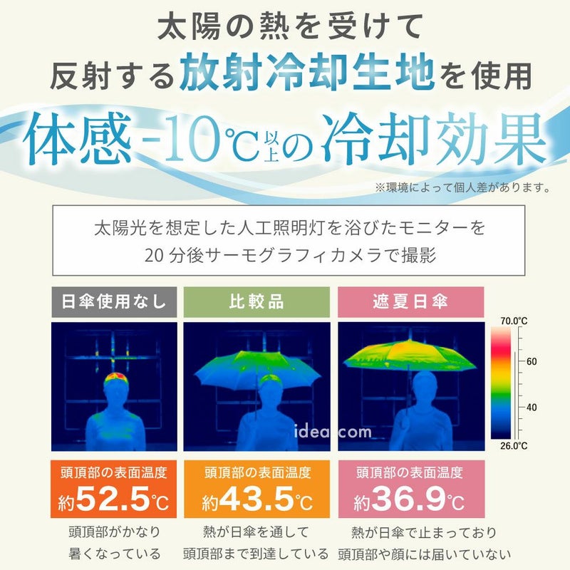 | 機能性 | 日傘 折りたたみ 完全遮光 放射冷却 体感-10℃以上の冷却効果 UVカット率約99.9% UPF50+ 遮光1級 近赤外線カット 遮熱 はっ水 グラスファイバー 軽量 黒コーティング 日焼け止め UV 紫外線 紫外線対策 日除け 涼しい |