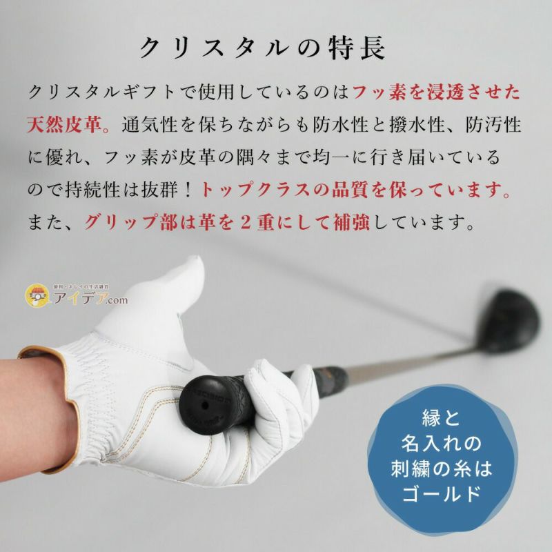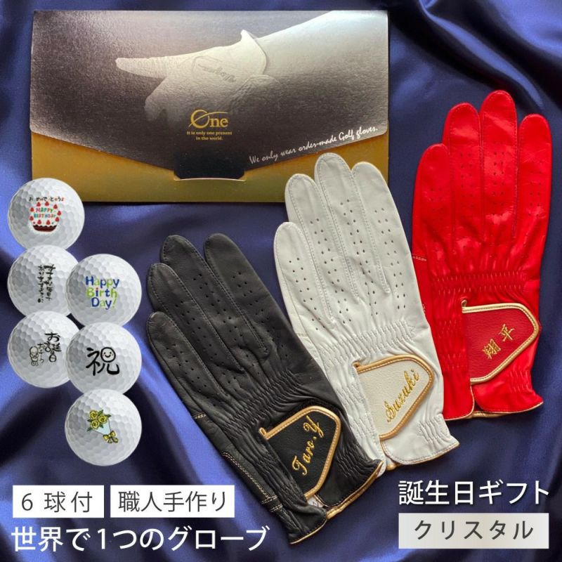 | ■商品特徴 | クリスタルギフトお仕立セット:天然シープにフッ素加工を施した水にも強い革を使用したオーダーグローブがお作りいただけます。グリップ部分は革を2重に補強しています。 グローブのお色目はブラック・ホワイト・レッドから選択可。名前は金糸で刺繍します。 |