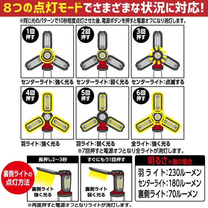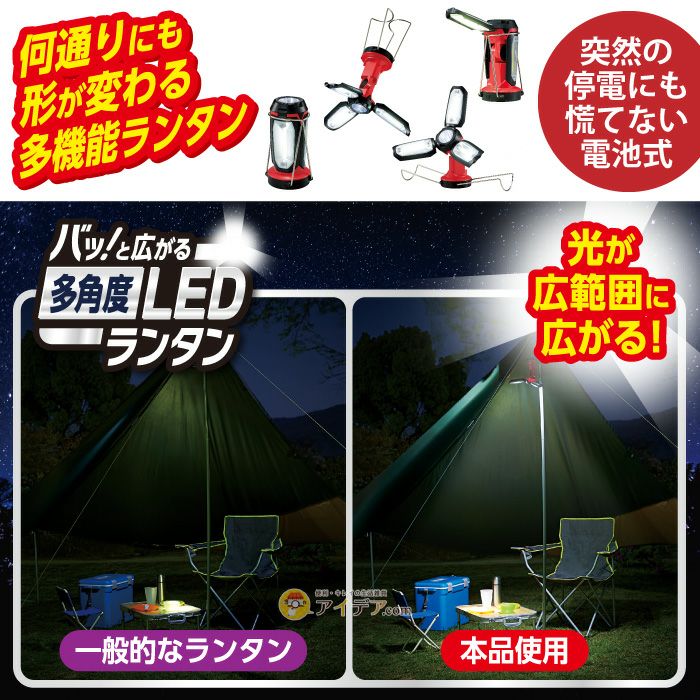 | 緊急時やアウトドアに。いろんなシチュエーションで変形! バッ!と広がる多角度LEDランタン ![]() 懐中電灯として・緊急時・夜道に・アウトドアに・枕元になど、いろんなシチュエーションで何通りにも形が変わる「バッ!と広がる多角度LEDランタン」。 8つの点灯モードでさまざまな状況に対応できます。一般的なランタンは光が一点に集中しますが、こちらは用途に合わせて形を変えることで、光が広範囲に広がります。 ![]() ![]() ![]() ![]() ![]() ![]() ![]() ![]() ![]() 懐中電灯として、吊るして、夜道に、停電時に、枕元に。普段の用途だけでなく、いざというときの緊急時にも活躍する備えとして点滅機能付となっております。 通常のランタンでは一方向だけの弱い光も、多角度LEDランタンなら広範囲を明るく照らしてくれます。 |