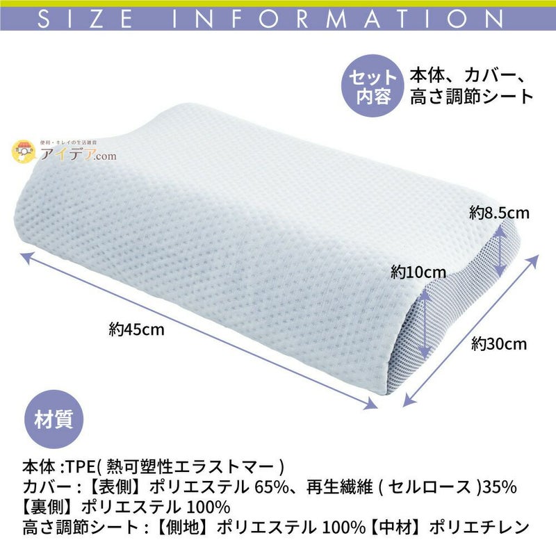 | ■材質 | 本体:TPE(熱可塑性エラストマー) カバー:〈表側〉ポリエステル65%、再生繊維(セルロース)35% 〈裏側〉ポリエステル100% 高さ調節シート:〈側地〉ポリエステル100% 〈中材〉ポリエチレン |