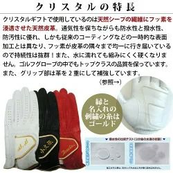 | ■商品特徴 | クリスタルギフトお仕立セット:フッ素加工を施した天然シープを使用したオーダーグローブがお作りいただけます。グリップ部分をあて革をし補強しています。 グローブのお色目はホワイト、ブラック、レッド、選択可。金糸で刺繍によるイニシャル等の名入れ(文字数制限有り)ができます。(英文字、漢字、ひらがな、カタカナ対応) |