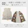 | ■使用上のご注意 | ●ポケットにたくさんの物を無理に入れたり、重い物を入れないでください。●着用時に座ったり、かがんだりするとポケットから物が落ちる場合がありますのでご注意ください。●洗濯機の手洗いモードでは洗えません。●洗濯により収縮する場合があります。●火気厳禁。 | ||