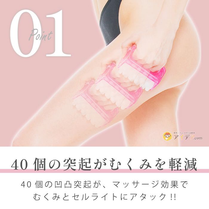 | ■使用方法 | セルライトの気になる部分をマッサージしてください。ハンドルを持って、適当な圧力を加えながらローラーを回転させるだけです。(力の入れすぎに注意してください。) シャワーをあてながら、マッサージするとより効果的です。湯船につかりながらのご使用も可能です。 |