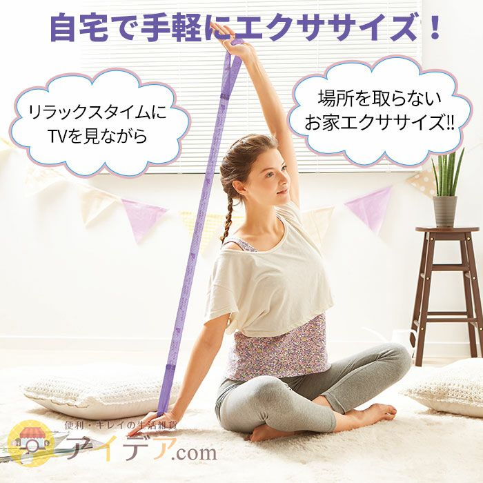 | ■使用上のご注意 | ●本品はゴム糸を使用しておりますので、アレルギーのある方はご使用にならないでください。●本品はトレーニング専用バンドです。本来の用途以外でのご使用はおやめください。●本冊子掲載のエクササイズは健康な方のための一般的なものです。ケガや病気後の筋力回復のためのリハビリにご使用される方は、使用前に必ず医師の相談を受けてください。●エクササイズ中またはエクササイズ後に気分が悪くなったり、身体に異常を感じた場合は、直ちにご使用をおやめください。●本品の特性上、よく伸縮する材質を使用しています。トレーニング中に身体に強く当たってケガをする場合がありますので、しっかりと握ってご使用ください。●本品は伸ばしすぎると切れる場合がありますのでご注意ください。●先端のとがったものや鋭利な物などには近づけないでください。●指輪やネックレスなどのアクセサリーは、必ずはずしてからご使用ください。●ご使用の際は、周りに人がいないことをご確認の上、十分な広さが確保できる場所でご使用ください。●水気や汗などが付着した状態で重ね置きしたり、床面に長時間放置すると床面に色移りする恐れがありますのでご注意ください。●本品は洗濯できません。汚れが生じた場合は、水に濡らして固く絞った布などで拭き取ってください。●お子さまが本品で遊ばないようご注意ください。思わぬ事故の原因となります。●お子さまの手の届かない場所で保管してください。●火気に近づけないでください。 | ||