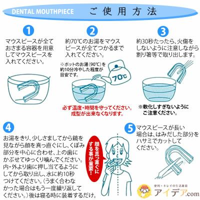 | ■使用上のご注意 | ●慣れるまで2~3週間かかります。最初の2~3日は数時間だけ使用しながら徐々に慣らしてください。慣れてきたら寝るときにはめてください。不具合が生じた場合はご使用をおやめください。※衛生面に配慮し、内ケースに入れております。取り出してお使いください。●下記に当たる方は使用しないでください。★鼻で呼吸をするのが困難な方★歯のぐらつきが大きい方★顎間接部、歯茎等に痛みや異常がある方★入れ歯の本数が多い方★本品を使用して顎間接部に痛みが生じたり、不快感が続く場合はご使用をおやめください。 | ||