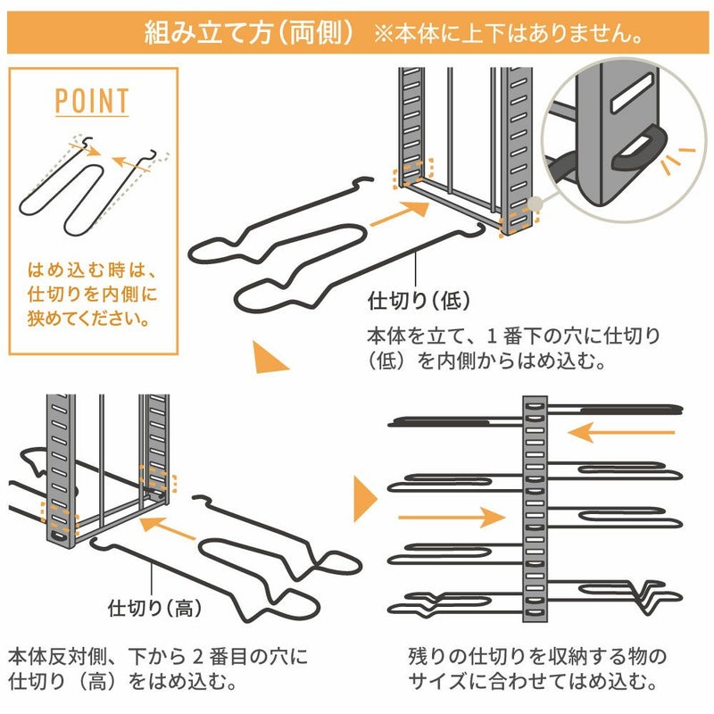 | ■使用上のご注意 | ●平らな場所でご利用ください。●転倒のおそれがあるため、耐荷重以上の物は収納しないでください。●収納する物のバランスによっては、仕切りがたわむ場合があります。●形状やサイズによっては収納できない場合があります。●指などを挟まないよう注意して組み立ててください。●仕切りが確実に取り付けられていることを確認してからご使用ください。●高温になる場所に置かないでください。変色・変形、やけどの原因となります。●熱いフライパンなどを収納しないでください。変色・変形・破損、火災の原因となります。●製品の汚れは、乾いた布で拭いてください。●濡れた場合は乾いた布で拭き、よく乾かしてください。濡れたまま放置するとサビの原因となります。●包装用の袋では遊ばないでください。窒息など思わぬ事故の原因となります。●本来の用途以外には使用しないでください。●火気厳禁。 | ||