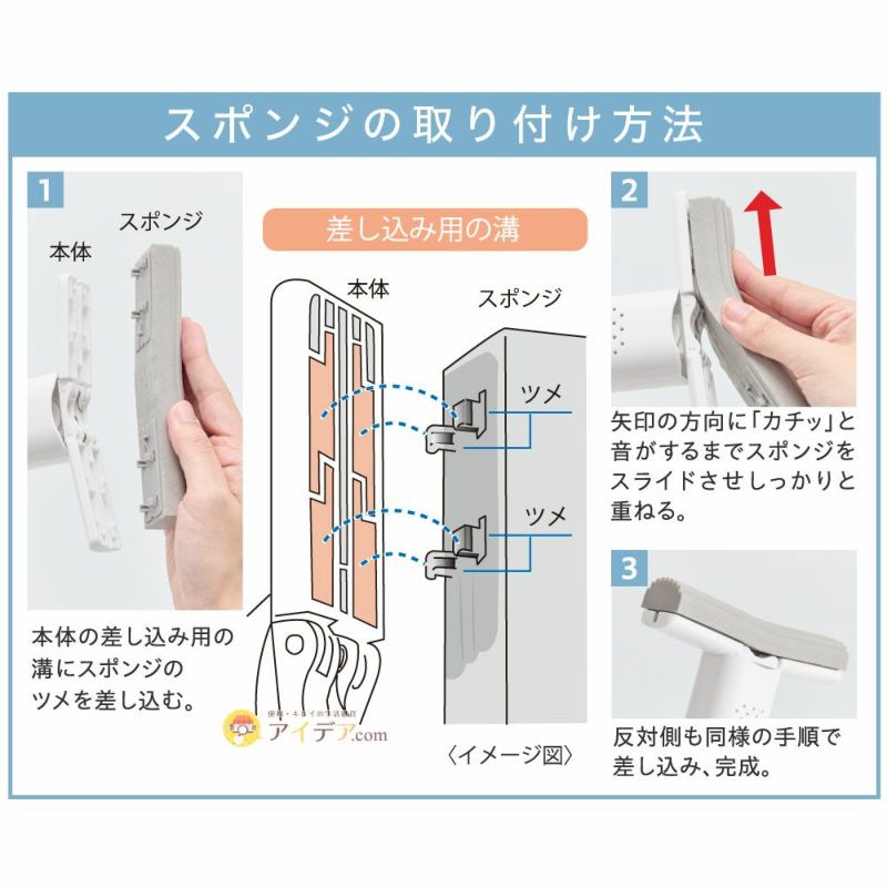 | ■使用上のご注意 | ●掃除する場所の形状や素材によっては、傷がつく場合がありますの で目立たないところで試してからご使用ください。 ●操作・スポンジを取り付ける際は、可 動部などで手をはさまないようにご注意ください。 ●掃除する場所の形状や素材によって は使えない場合があります。 ●力をかけすぎると、ハンドルが曲がったり接続部分が破損 することがありますのでご注意ください。 本品が破損した場合は使用しないでください。 ●表面加工が施されている場所でのご使用は、表面の加工がはがれる恐れがありますの で使用しないでください。 ●スポンジ表面に多数の気泡が見られますが品質や使用に問 題はありません。 ●本体が汚れた場合は水または中性洗剤を薄めた液で拭き、日陰でよく 乾かしてください。 スポンジが汚れた際は水洗いし、風通しのよい所で乾燥させてから保 管してください。大きなゴミ、ほこりはあらかじめ取り除いてからご使用ください。変色 や変質の恐れがありますので、アルカリ性や酸性の洗剤・熱湯は使用しないでください。 ●お子さまの手の届かない所に保管してください。●劣化・変色するため、直射日光の当た らない場所に保管してください。●火気厳禁。 | ||
