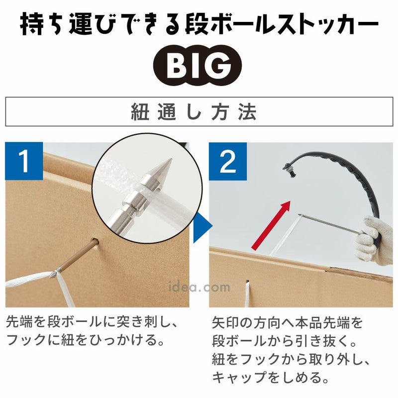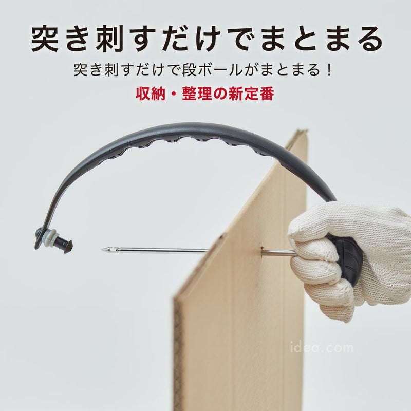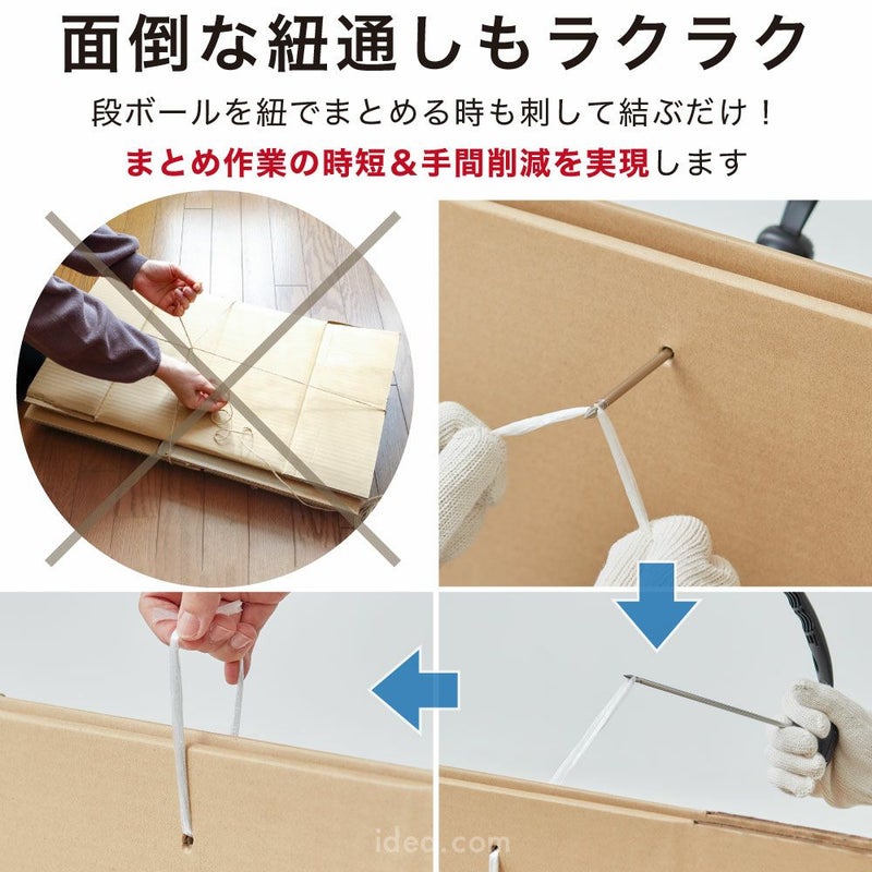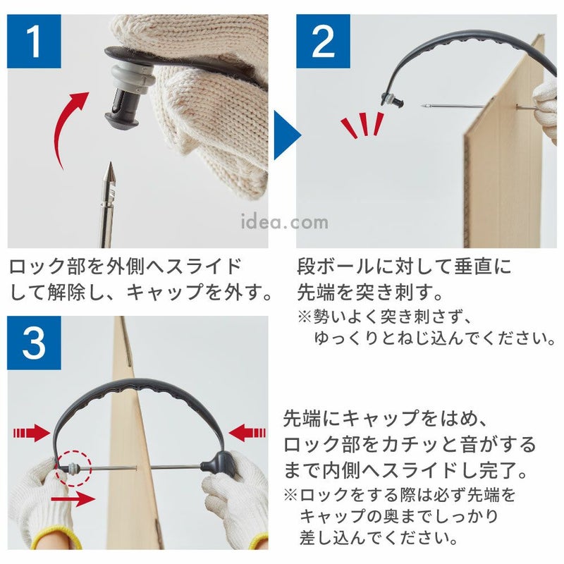 段ボールの固定方法も簡単。ロック部のキャップを外し、先端を段ボールの束に突き刺してセット。ロックを内側にスライドさせればしっかり固定されます。紐通しもスムーズに行えるよう、先端形状やガイドが工夫されており、作業時間を短縮できます。