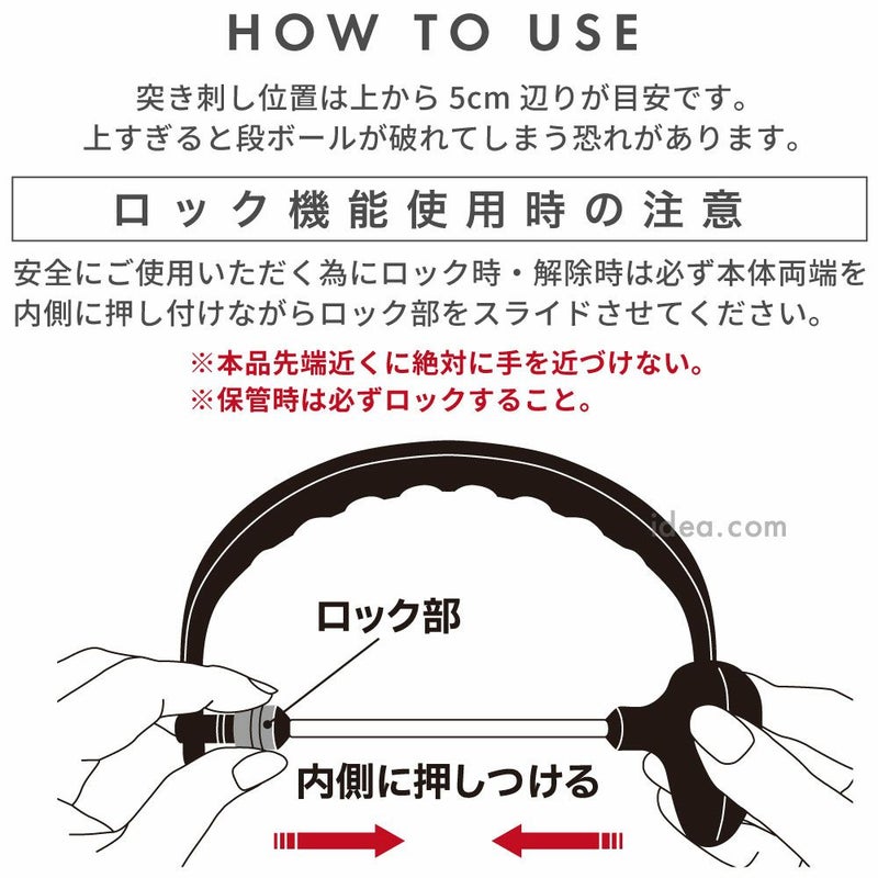 ■使用上のご注意 ●作業時は、周りに人がいない事を確認してください。また本品先端の近くに絶対に手を近づけないでください。●ロック部が動きにくい場合は、無理に動かさず先端をキャップの奥まで差し込んでからスライドさせてください。●先端が鋭利ですので、取り扱いには十分ご注意ください。●使用時は必ず安全手袋を着用し、ケガや事故には十分ご注意ください。●段ボールの種類によっては突き刺しにくい場合があります。●収納目安に従ってご使用ください。●持ち運ぶ際や、保管時は必ずロックをしてください。●変形・破損した場合は、直ちに使用を中止してください。●お子さまの手の届かない所に保管してください。●本来の用途以外に使用しないでください。●火気厳禁。