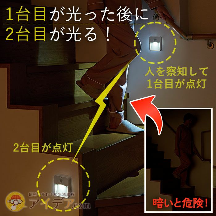 | ■使用上のご注意 | ●落下させる、踏みつける、投げつけるなど強い力や衝撃、振動を与えるなど本体が破損するようなことはしないでください。万が一落下しても安全な場所に取り付けてください。●点灯中のライトを直視しないでください。●布や紙など燃えやすい物の近くに取り付けないでください。●本品を水に浸けないでください。●本品は周囲の明るさと温度変化を感知するため、以下のような場所では取り付けないでください。誤作動や感知しない場合があります。・他の照明器具などがある明るい場所・カーテンの近くや風などで揺れる植物の近く・風が吹き込む窓の近くやエアコンなどの送風を受けるところ・ペットの通るところ・取り付け高さが1.5m以上のところ・電波の強いところ・暖房器具の近く・モーターなど磁場が発生する機器の近く・大理石の床や壁など光の反射を受けるところ・ガス機器や排気口など温度の高くなるものの上・不安定なところ・強い衝撃を受けるところ●本品を以下のような場所に取り付けないでください。故障やトラブルの原因となります。・直射日光が当たる場所・水がかかる場所・浴室など湿気の多い場所・浸水するおそれのある場所・置いて使用する場合は、転倒して危険な場所●乳幼児の手の届く場所に置かないでください。また、乳幼児や子どもが本品で遊んだり一人で使用したりしないように注意してください。●火気厳禁。 | ||