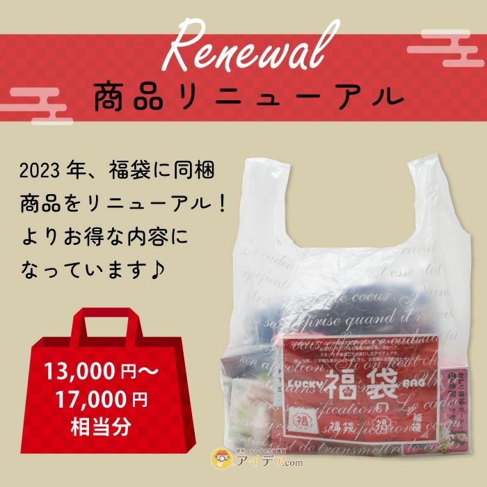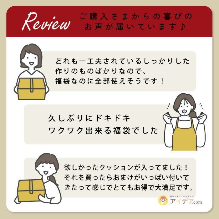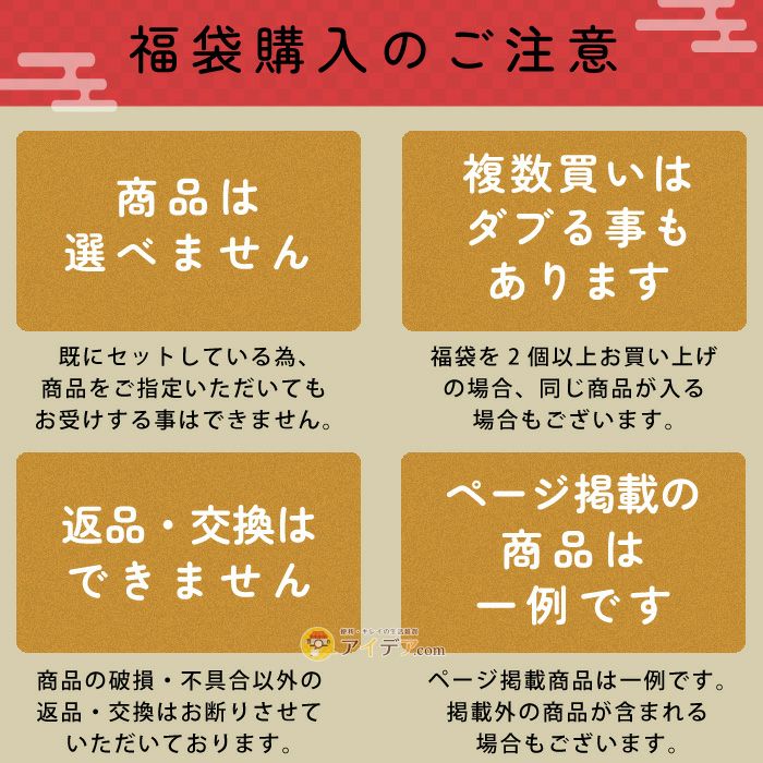 | 何が入っているかはお楽しみ♪ 超お得な福袋 アイデア日用品・雑貨アイテム・贅沢おもしろ福袋 ![]() ![]() ![]() ![]() ![]() ![]() アイデア.comの人気商品を集めた 贅沢おもしろ福袋!アイデア商品 日用品等 雑貨が7~10品が入っています!メーカー希望小売価格13,000円~17,000円相当分ですので、超お得!! 送料無料で3500円♪ 数量限定ですので、この機会をお見逃しなく!! |