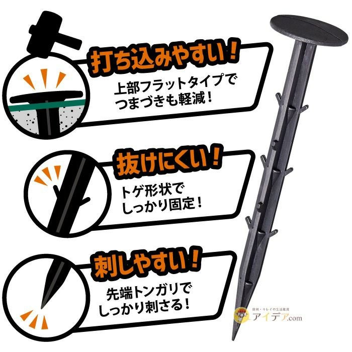 | ■使用上のご注意 | ●シートの固定以外では使用しないでください。●固定したピンを無理に抜くと破損の原因になることがあります。●安全のため、必ず手袋などを着用して作業を行ってください。●本品を打ち込む際は、地中の埋設管などに十分ご注意ください。●使用場所によっては本品が刺しにくい場合があります。無理に刺すと破損する恐れがありますのでご注意ください。また、強い力をかけると折れる場合があります。●本品の使用状況により、設置したシートがはがれる場合があります。●火気の近くや高温になる場所では、ご使用にならないでください。●お子様が本品で遊ばないようご注意ください。 | ||