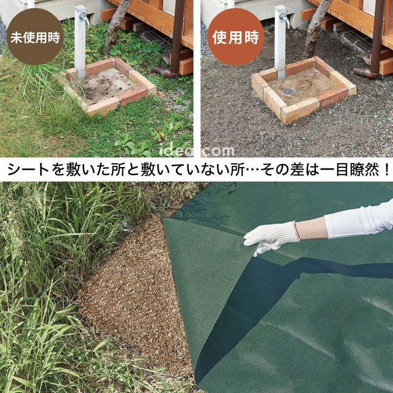 ![]() 使い方はとっても簡単!シートを敷く面積に合わせてハサミでカット。地面に直に敷いて、シートの上に砂利または砂をかぶせてできあがり。砂利または砂がない場合は土でも可能ですが、土の厚さは5cm以下目安で使用してください。(シートは表・裏がありませんので、両面どちら側でもご使用できます。)
