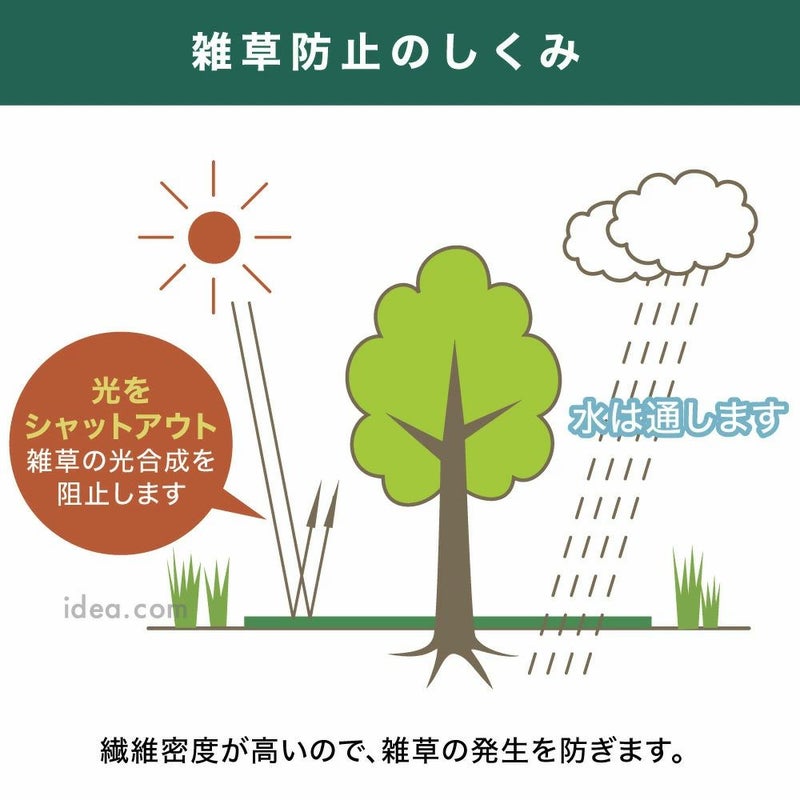 ![]() 雑草防止のしくみが以下の通り!光をシャットアウトして雑草の光合成を阻止します!そして【手間いらず雑草防止シート】は繊維密度が高いので、雑草の発生を防ぎます。