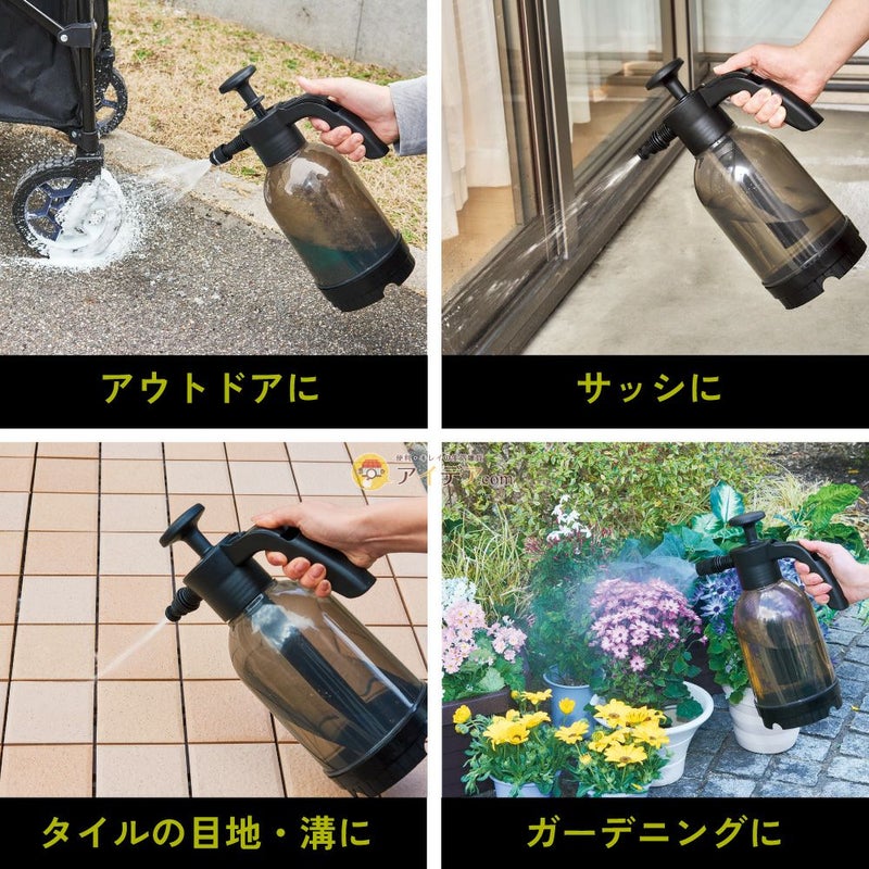 | ■使用上のご注意 | ● 分解、修理、改造を行わないでください。 ● ガソリン、灯油などの可燃性液体は絶対に使用しないでください。 火災や事故の原因となります。 ● 人や動物に向けて使用しないでください。 ● お子さまが本品で遊ばないようご注意ください。 ● ボトルに腐食やひび割れがある時は使用しないでください。 ● 粘度の高い液体、強酸性、アルカリ性の液体は絶対に使用しないでください。 ● 洗浄剤は必ず水溶性の液体をご使用ください。粘度の高い液体は ノズルの詰まりの原因となります。 ● 洗浄剤は発泡性のあるのものをご使用ください。発泡性のない液体洗浄剤を 泡にして噴射することはできません。 ● 洗浄剤を入れて使用する際は、洗浄剤の注意事項をよくご確認ください。 ● ボトルの目盛り2L以上に液体を入れないでください。目盛りは多少の誤差が ありますので、目安としてください。 ● 40°C以上の液体を使用しないでください。 ● 本品が正常に作動しない場合は使用しないでください。 ● 本品は立てた状態で使用してください。 ● 使用後は直ちにスプレーヘッドを開けてボトル内の圧力を解放してください。 加圧しすぎると破損します。 ● 使用後は本品をきれいに洗い、十分に乾燥させて保管してください。 ● 濡れたまま放置するとカビや破損の原因となります。 ● 水圧により多少水漏れする場合があります。 ● お子さまの手の届かない所に保管してください。 ● 直射日光の当たるところで保管しないでください。 ● 凍結する恐れのあるところでの使用、保管はおやめください。 ● 本来の用途以外には使用しないでください。 ● 火気厳禁 | ||
