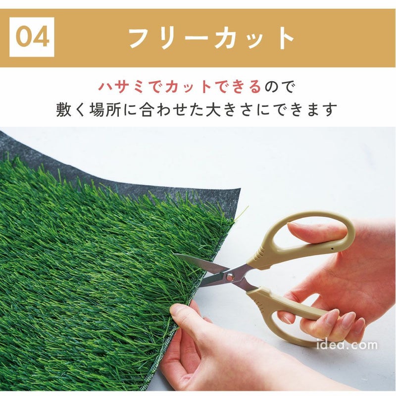 マットを敷くだけで簡単にイメージ チェンジ。防草シート一体型の人工芝マット。ハサミでカットできる。