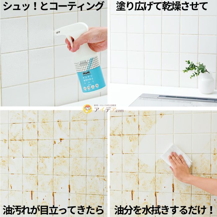 | シュッと!コーティング 油汚れが付着しても水拭きだけでキレイに キッチン油汚れ防止ミスト バリアブラ ![]() 油汚れのお掃除を水拭きだけでラクに!キッチンの壁、IHクッキングヒーター、レンジフード、換気扇のファンなど。こびりつくとなかなか落ちないキッチンの油汚れに。 シュッ!とコーティングしておくだけで、油汚れのお掃除をラクにしてくれるスプレーです。 油汚れが目立ってきたら、浮いた油分を水拭きするだけ!力を入れてこする必要もないので、キッチンのお掃除がとっても楽になること間違いなし。 ![]() ![]() ![]() ![]() ![]() ![]() ![]() 簡単3stepでコーティング♪水拭きだけで油汚れがコーティング剤ごときれいに落とせます。 【キッチン油汚れ防止ミスト バリアブラ】は、キッチン掃除の手間を大幅に減らしますよ! |
