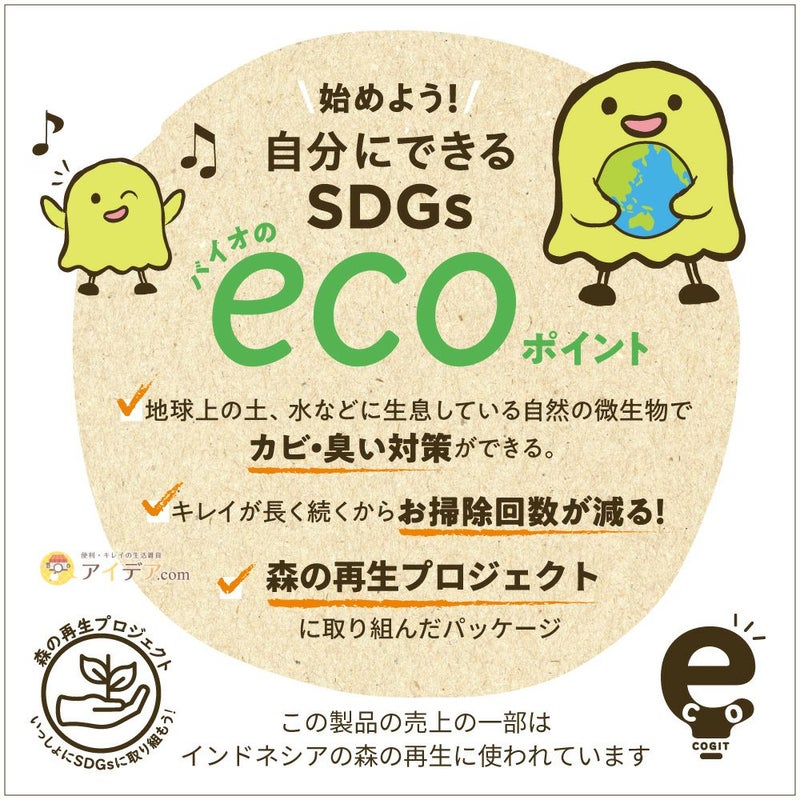 | ■使用上のご注意 | ●お子さまがいたずらしないよう、ご注意ください。●本品の特性上、開封時および設置時しばらく製品特有のにおいがする場合があります。お使い頂くうちににおいは薄まります。また、においによる品質への影響はありません。●効果持続期間は使用状況により多少異なります。●バイオは生き物です。環境によって活動が変化するため、効果が目に見えて現れてくる時期は状況によって異なります。●環境下に汚れや悪臭の原因となる物質などの有機物が異常に多い場合、効果を感じるのに時間がかかります。●本品設置中に殺菌・抗菌効果の高い商品との併用はバイオが死滅する恐れがありますのでおやめください。●凹凸のある面や貼り付け箇所の材質によっては、落ちてくる可能性がありますのでご注意ください。●貼り付け箇所に両面テープが残る場合があります。残った場合は市販のシールはがしなどで取り除いてください。●本来の用途以外には使用しないでください。 | ||