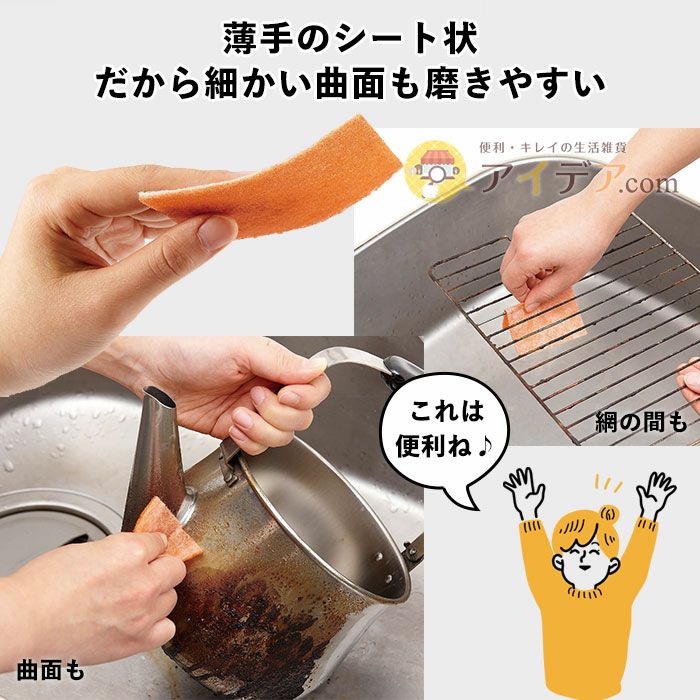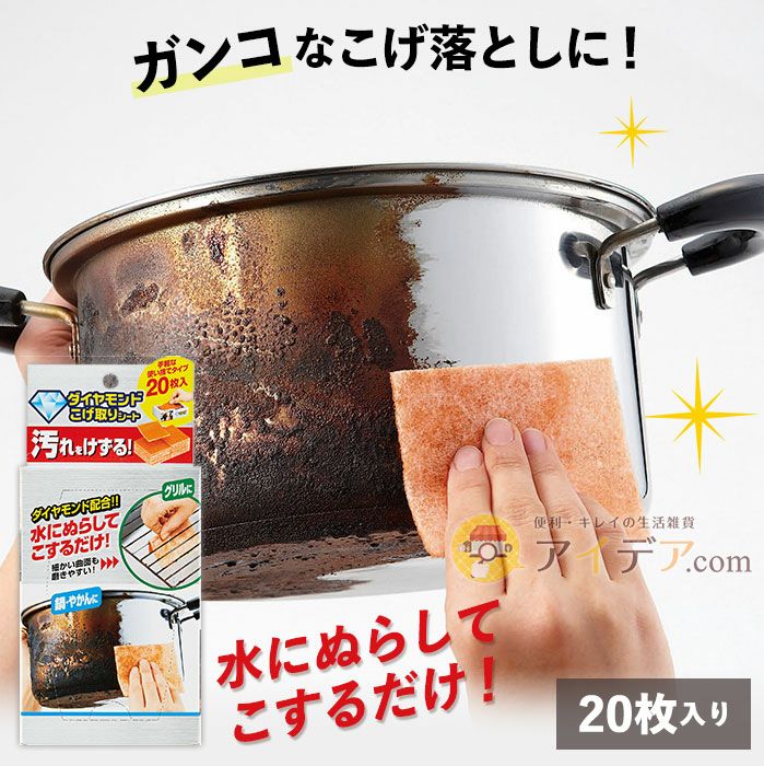 今までこすり洗いが大変だったこげとり。 ダイヤモンドを配合したシートで、ゴシゴシしなくてもきれいに落とせます。 鍋ややかん、フライパン、魚焼き網、シンク、まな板などをまるで新品のようにピカピカにしてくれます。 心機一転お料理に気合が入りそうです♪ |