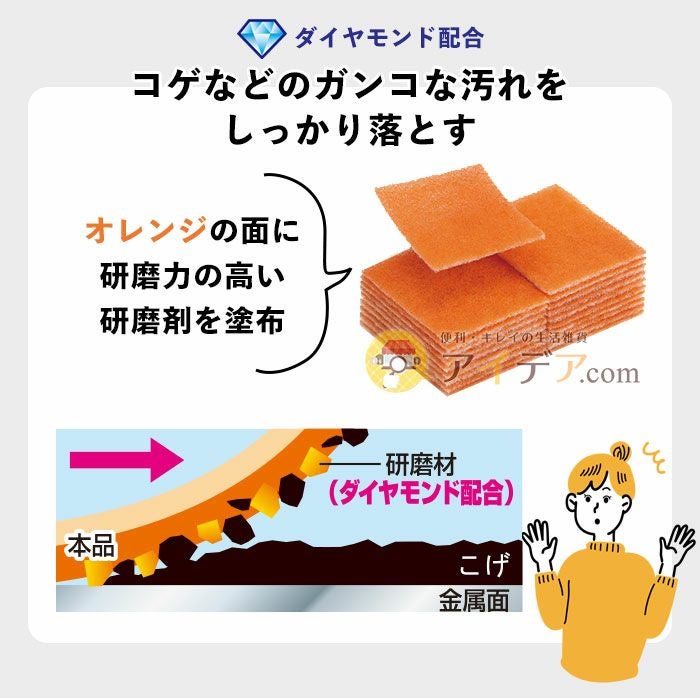 | ■使用上のご注意 | ●いずれの場合も、キズがつかないように、柔らかくこすってください。強くこすると、キズがつく場合がありますので、目立たないところで試してから使用してください。●IHクッキングヒーター、ガラストップのガスレンジ、フッ素樹脂コートの加工面や、塗装・滑り止め加工をしたまな板には使用しないでください。●木製まな板は木目に沿ってこすってください。●プラスチック製のまな板は表面の凹凸がとれる場合があります。●表面加工された鍋には使用しないでください。●塗装された場所や表面の柔らかな場所には使用しないでください。●洗剤と一緒に使わないでください。●皮膚の弱い方は、手袋をしてから使用してください。●使用後は、お住まいの自治体が定める方法に従って分別してください。●火気に近づけないでください。●本来の用途以外には使用しないでください。 | ||