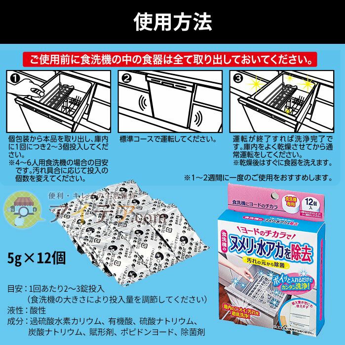 ■使用上のご注意 ●本品は食べられません。お子さまの手の届く場所に置かないでください。●本品は食器を洗う洗浄剤ではありません。食器を入れて使用しないでください。●皮膚についた時は、流水で洗い流してください。異常があった場合は医師に相談してください。●手肌の弱い方は手荒れ防止のため、手袋等をご使用ください。また使用後は、手を水でよく洗いクリーム等でのお手入れをおすすめします。●使用中に目がしみたり、せき込んだり、気分が悪くなった際はその場から離れ、洗眼やうがいを行ってください。●濡れた手で本品を取り出すと溶けてしまう場合がありますので、必ず乾いた手で取り出して使用してください。●汚れがひどい場合は完全に洗浄できない場合がありますので、繰り返し使用してください。。●洗浄は必ず標準コースで洗浄してください。節約コースなどでは効果がでない場合があります。●製品の特性上、まれに変色している場合や、特有のにおいがする場合がありますが、品質への影響はありません。●本品を投入したことにより、機能を妨げる恐れのある食洗機にはご使用にならないでください。●アレルギー体質の方はご使用にならないでください。●本品は食洗機専用の洗浄剤です。他の用途には使用しないでください。●他の洗浄剤と併用・混合はしないでください。●強い衝撃を与えると割れる場合があります。●直射日光及び、高温多湿になる場所を避け、冷暗所に保管してください。