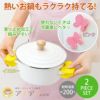 | ■使用上のご注意 | ●本品は熱くなった鍋や陶器をつかんで移動させるための補助具です。本来の用途以外では使用しないでください。●素材の特性上、使い始めはシリコーンゴム特有の臭いを感じる場合がありますが、ご使用には問題ありません。●ご使用の際は本品から指がはみ出さないように注意してください。やけどをする恐れがあります。●重い鍋や陶器に使用される場合は、必ず本品を2個使用し、両手でつかんでください。●本品を無理にひねったり、折り曲げたりすると磁石がはずれたり破損する恐れがあります。●素材の特性上、本品に食材の匂いが付いたり、変色する場合がありますが、ご使用には問題ありません。●本品が破損、または使用中に破損した場合は、ただちに使用を中止してください。●汚れが付いた場合は軽く水洗い、もしくは中性洗剤で洗ってください。●タワシや研磨剤入りのクレンザー、漂白剤などは使用しないでください。傷や破損など、劣化の原因となります。●使用する前に、貼り付ける面についた汚れ・ホコリなどをキレイに拭き取ってください。水拭きをした際はしっかりと乾かしてから本品を使用してください。●お子さまの手の届かない所に保管してください。●火気に近づけないでください。 | ||