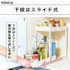 4段階の高さ調節で、ボトル類から洗剤などの詰め替えパックまでスッキリ収納。下段はスライド式で奥のモノも取り出しやすく、さらに便利なフック付きで小物整理もおまかせ。設置も工具いらずでラクラク!滑り止め付きで安定感も抜群。シンク下はもちろん、洗面台下やストック棚としても活躍する万能ラックです。