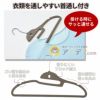 | ■使用上のご注意 | ●収納専用ハンガーです。洗濯ハンガーとしては使えません。●強くこすると色落ちする可能性があります。また濡れた洗濯物や汗などで湿った洋服には、色移りする可能性がありますので、ご使用にならないでください。●フック部は回転式です。固い場合、無理に回すと破損する可能性があります。●ハンガー同士を連結させて吊るす際は、3本までとしてください。●破損の原因となるため、過度な荷重や衝撃を与えないでください。●長時間直射日光に当てないでください。●お子さまの手の届かない所に保管してください。●火気に近づけないでください。●本来の用途以外には使用しないでください。 | ||