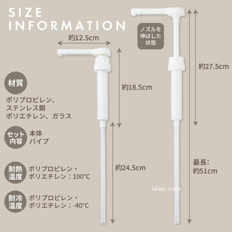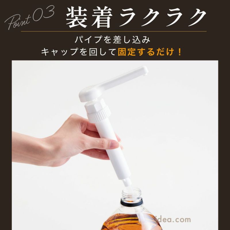 ■使用上のご注意 意 ●日本製の大容量ペットボトル専用です。海外製のペットボトルには使えません。対応サイズのペットボトルでも形状によってはお使いいただけない場合があります。●平らな場所で使用してください。●装着した状態で持ち運ぶ際は、本品をつかまずペットボトルを持ってください。●本品を装着したままペットボトルを倒したり落下させると、液漏れ・破損・故障の原因となりますのでご注意ください。●固形物が含まれる液体や粘度の高い液体に入れるとつまる場合があります。●本品は保存用ではありません。長時間使用しない場合は、よくすすぎ洗いし水気を切って中をよく乾かしてから保管してください。●取り外しの際に、本品内に多少の液が残りますのでご注意ください。●熱湯での洗浄、漂白剤・研磨剤等のご使用はしないでください。●電子レンジ、冷凍室、食器洗浄機、食器乾燥機では使用できません。●お子さまの手の届かない所に保管してください。●火気厳禁