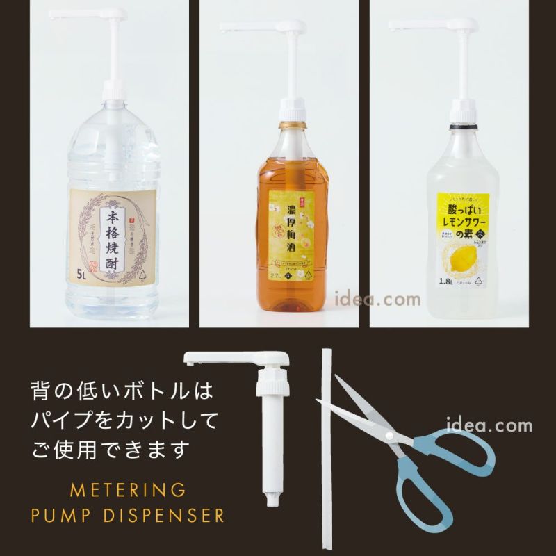 取り付けはカンタン。ノズルにパイプを差し込んでボトルにセットするだけ!しかも、一般的な日本製大容量ボトル(1.8L~5L・外径36mm)に対応してるから、焼酎やウイスキー、梅酒や割材まで使えます。自宅の晩酌タイムも、お店のドリンク提供もこれひとつでOK!