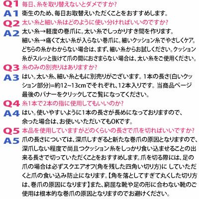 | ■セット内容 | クッション糸(細糸6本、太糸6本)、スティックガイド1本、取扱い説明書 | ■使用上のご注意 | ●本品は治療用ではありません。●巻爪がひどく、歩行も困難な方は、使用前に必ず医師にご相談ください。●重度の巻爪の方や、巻爪により炎症、化膿している方は使用しないでください。●使用中、使用後に症状が悪化したと感じた場合は、直ちに使用を中止し、医師にご相談ください。●衛生上、クッション糸は毎日取り替えてください。●必要以上にクッション糸を爪の奥に押し込まないでください。●クッション糸をカットする際は、ハサミでケガをしないようご注意ください。●巻爪が非常に軽度の場合、クッション糸が爪の間から抜ける場合があります。●クッション糸が爪の間に入りにくい場合は、スティックガイドを使わず直接クッション糸を先端から差し込むようにしてください。●本来の用途以外に使用しないでください。●火気に近づけないでください。 |