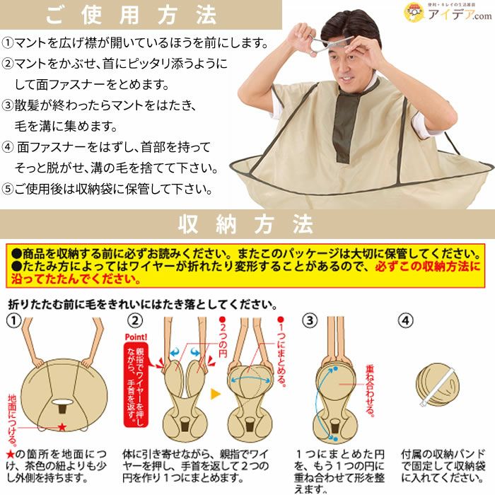 | ■使用上のご注意 | ●マントを広げる時、バネの力で少しはねますのでご注意ください。●肩幅の個人差により、髪の毛がうまくキャッチ出来ない場合がございます。●直射日光の当たる場所でのご使用、保管はお避けください。 | ||