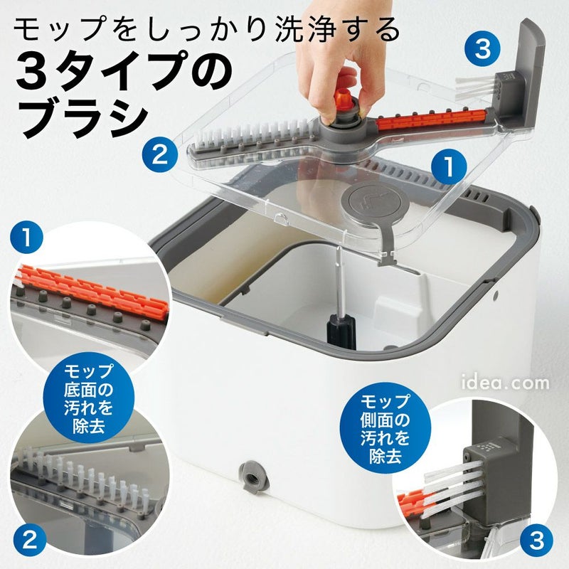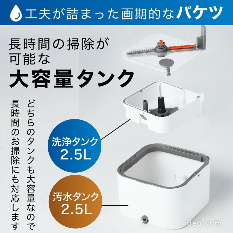| ■使用上のご注意 | ●掃除する場所の形状や素材・汚れの種類によってご使用になれない場合があります。●洗浄中や脱水中は、モップヘッド・モッププレート・バケツ内部に触れないでください。●分解、修理、改造を行わないでください。●壊れやすい物や倒れやすい物の近くでは使用しないでください。●安定した場所で使用ください。●上に乗ったり、落下させる、引きずるなど強い衝撃を与えないでください。●本品は室内用です。屋外で使用しないでください。●次の汚れには使用しないでください。灯油・ガソリン・シンナーなどの引火性液体や有機溶剤、タバコの吸い殻などの火気、トナーなどの可燃性の粉末や液体、ガラス片・ビンの破片、刃物などの鋭利なもの、大量の砂や粉・小石など、ヒモなど巻き付きやすい汚れ。●必ず全ての部品を正しく取り付けてご使用ください。●モップに付着したゴミは、必ず取り除いてから使用ください。●洗浄タンクには必ず2.5Lの水道水のみを注水してください。●汚水タンクに汚水が溜まっている状態で洗浄タンクに水を継ぎ足さないでください。●使用後は必ず排水し、本品をきれいに洗い、十分に乾燥させてから保管してください。●モップパッドは、洗濯により伸縮する場合があります。●直射日光が当たる場所や、高温多湿の場所に放置しないでください。●包装用の袋で遊ばないでください。窒息など思わぬ事故の原因となります。●お子さまが本品で遊ばないようご注意ください。●お子さまの手の届かない所に保管してください。●処分する際は、お住まいの自治体が定める方法に従って分別してください。●火気厳禁。 | ||