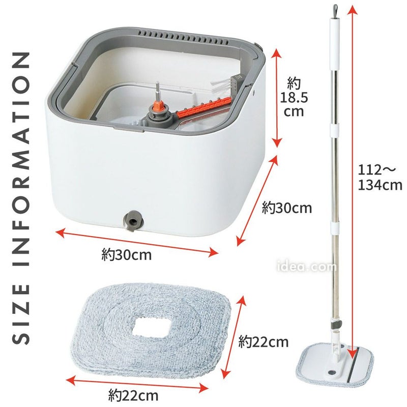 | ■製品サイズ(約) | バケツ:30x30x18.5cm モップ本体:22x112cm(伸ばした場合134cm)モップパッド:22x22cm | ||