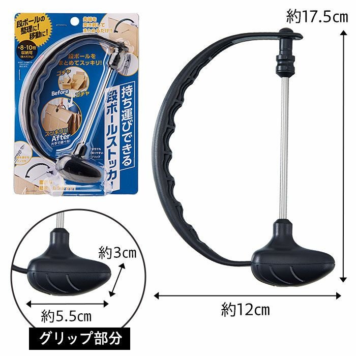 この小さなブラックのストッカーで、約8~10枚のダンボールを1つにまとめ!簡単にまとまることができ、便利です。最大重量は3キロまで。片手で持ち運べます。