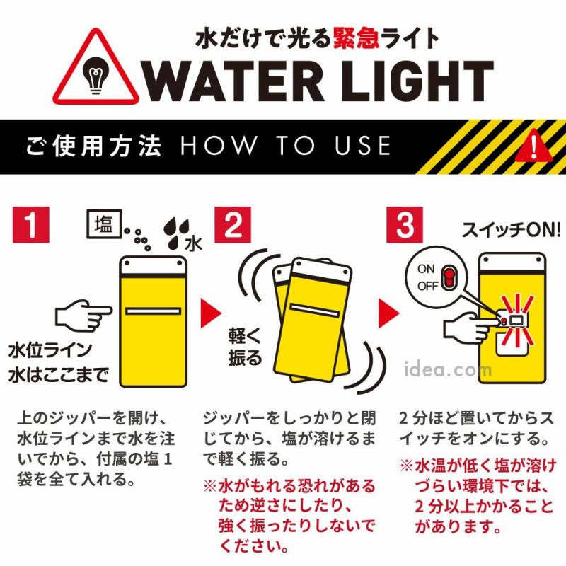 | ■使用上のご注意 | ●袋の中の液体は飲み物ではありません。●小さなお子さまの手の届かないところで使用してください。●本品の分解や改造、または修理を絶対にしないでください。●水は裏面記載の水位ラインまで必ず入れてください。●付属の塩以外をご使用にならないでください。●塩が溶けていない場合は点灯しません。点灯しない場合、塩が溶けるまで軽く振ってください。●本品に水を入れたあとは、本体を逆さまにしたり、強く振ったりしないでください。水がもれる恐れがあります。●本品は、塩水と製品内のアルミ板の化学反応により発電します。約140時間はオン・オフを繰り返して使用できます。●連続最長点灯時間は約140時間です。ただし、条件によって最長点灯時間は異なります●-10°C以下の環境ではご利用になれません。●約140時間以上使用したもの、あるいは水を入れてから2週間経過したものは廃棄してください。廃棄の際は、お住まいの自治体に処理方法をご確認ください。●火気厳禁。 | ||