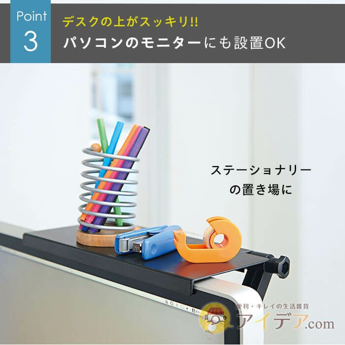 ■使用上のご注意 ●モニター幅が34cm未満の物には設置できません。 ●取り付け可能サイズ及び、モニターの形状をよくご確認の上、設置してください。●モニターの形状によっては取り付けできない場合があります。●設置前に、モニターまわりのホコリや水気を取り除き、本品が傾かないように注意して取り付けてください。●正しく設置した場合、本品の耐荷重は約1kgです。耐荷重以上の重さのものを乗せないでください。また、荷重が偏らないよう小物の置く位置にもご注意ください。●耐荷重以内であっても、モニターの構造や安定性によっては、転倒する場合があります。●本品は簡易棚です。落下の恐れのある物、割れ物、水気を含むものなどは乗せないでください。●本品を取り付けた際、モニター画面の一部が隠れる場合があります。●使用状況や環境の変化により本品が外れる場合があります。●取り付け後、ネジなどに緩みがないか安定性を必ずご確認ください。●強い衝撃を与えると、変形や破損の原因となります。●部品が損傷したり異常があるときは、本品を使用しないでください。●物を乗せた状態で本品を付け外ししないでください。また、強い力を加えたり、もたれかかったりしないでください。●設置および開閉の際に、手をはさまないようご注意ください。●お子さまが本品で遊ばないようご注意ください。●お子さまの手の届かない所に設置、保管してください。●火気に近づけないでください。●本来の用途以外には使用しないでください。