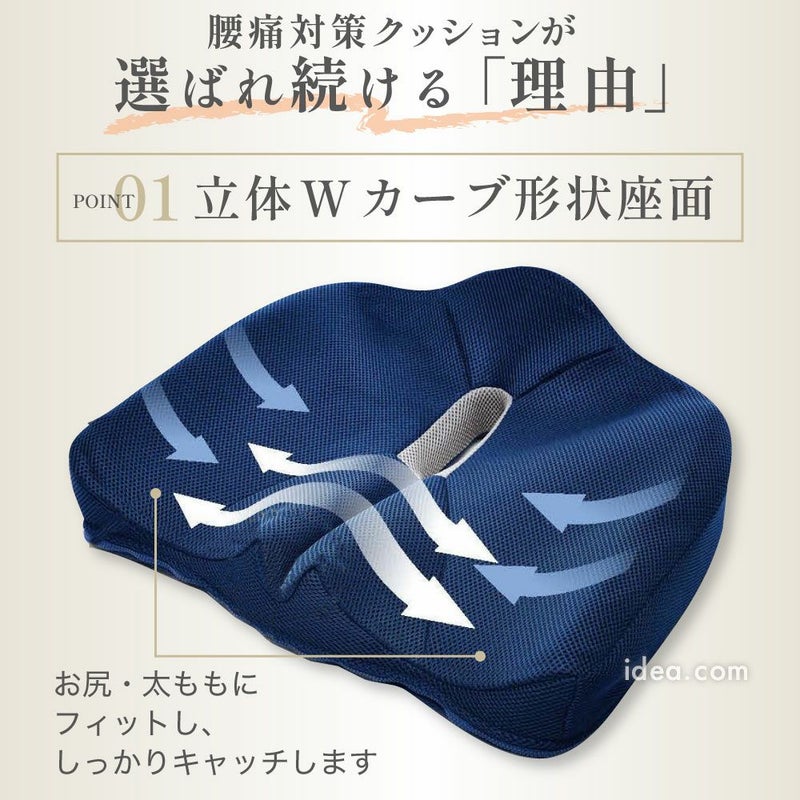 | 立体的な座面で骨盤を立て、正しい姿勢に 腰痛対策クッション ![]() すぐに購入したい方はこちら ![]() ![]() ![]() ![]() ![]() ![]() ![]() ![]() ![]() 正しい姿勢をサポート!腰にやさしい快適クッション 長時間のデスクワークや勉強で「腰が重い」「座っているのがつらい」と感じていませんか?【腰痛対策クッション】は、そんな日常の悩みを解消するために開発された快適サポートアイテムです。 立体Wカーブ形状座面で腰まわりの自然なカーブを支え、骨盤を安定させながら正しい姿勢へと導きます。これにより腰やお尻に集中しがちな体圧を分散し、長時間座っていても疲れにくい環境をつくります。デスクワークはもちろん、テレワークや勉強、リビングでのリラックスタイムにも最適。日常のあらゆるシーンで腰をやさしく支えてくれます。 また、竹炭配合低反発ウレタンを使用することで、低反発特有の体圧分散による快適な座り心地に加え、竹炭の「消臭・調湿効果」でいつでも清潔。長時間座っても蒸れにくく、ニオイが気になりにくいのが特長です。抗菌性もあるため、毎日のオフィスや在宅ワーク、車内でも衛生的に使えて、快適さと耐久性を兼ね備えたワンランク上のクッションです。 カバーは通気性に優れたメッシュ素材を採用しているためムレにくく、季節を問わず快適。取り外して洗濯できるので、いつでも清潔に保てます。デザインもシンプルだから、オフィスやリビングなど場所を選ばず使いやすいのも魅力です。 腰痛対策を始めたい方や、長時間座ることが多い方におすすめの【腰痛対策クッション】。毎日の座り時間をもっと快適に、もっと健康的に変えてみませんか?正しい姿勢をサポートすることで、仕事や勉強の集中力もアップ。腰にやさしい暮らしを今すぐ手に入れましょう。 |