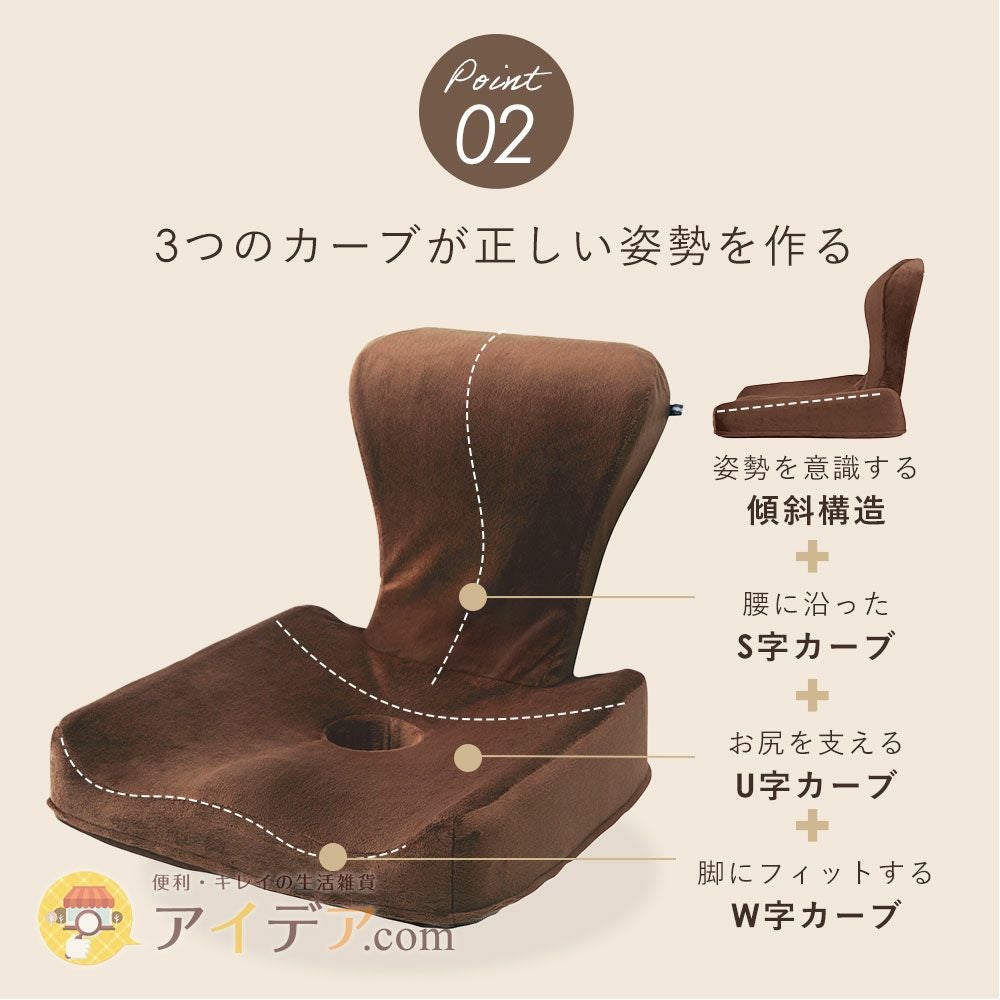 4,378円 | 43×38×14.5cm | ネイビー・ブラウン | カバー:ポリエステル、本体:ウレタンフォーム | 〇 | 立体Wカーブ形状座面、長時間座っても疲れにくい | 購入する |