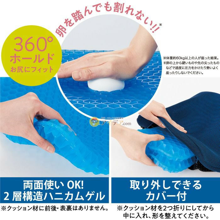 4,378円 | 40×37×4cm(カバー含む) | ネイビー | カバー:ポリエステル100%、本体:TPE(熱可塑性エラストマー) | 〇(カバーのみ) | 椅子で使用した時クッションの高さが気にならない、通気性が良い | 購入する |