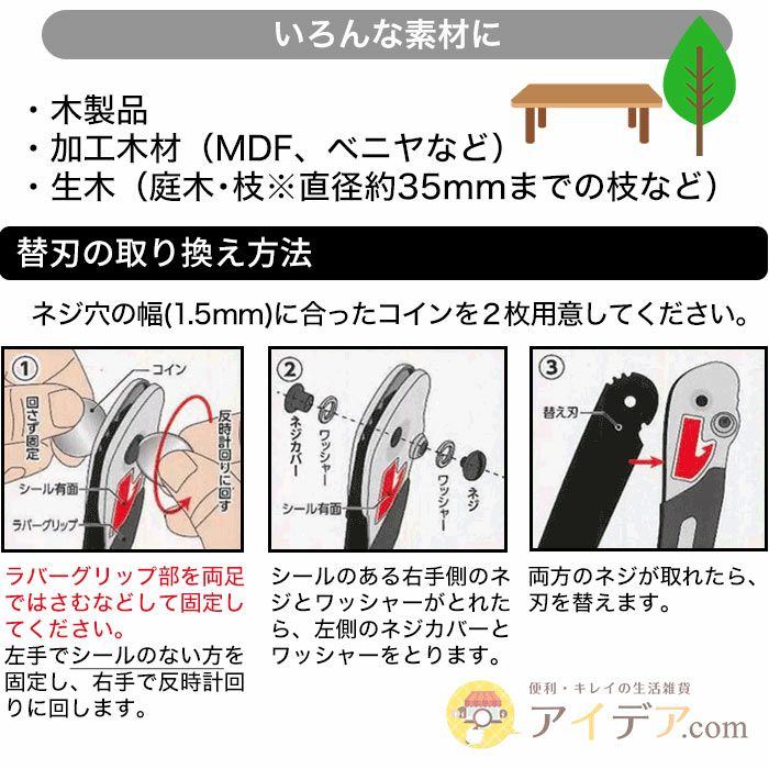 | ■使用上のご注意 | ●本品は「多目的廃棄物ノコギリ」専用の替え刃となっております。替え刃単体での使用や、他の器具などに取り付けて使用することはできません。●本品は廃品の解体を目的としています。日曜大工や工作等、効率よくキレイに切断することを目的とする場合は、素材にあった専用のノコギリをご使用ください。●刃物ですので、取り扱いや保管には十分ご注意ください。●刃の取り換え時や使用時は必ず安全手袋とゴーグルを着用し、ケガや事故には十分ご注意ください。切断物の破片や折れた刃が飛ぶ可能性があります。●切るものの材質や形状により、切断しにくいものや、切断できないものがあります。●破損やケガの原因となりますので、無理に切断することはお避けください。●切断した対象物が刃に目詰まりした場合は、必ず取り除いてよく切れる状態を保ってください。またその際は、安全手袋などをご使用の上、ケガのないよう安全には十分配慮して慎重に行ってください。●使用後は必ず汚れや水分を拭き取って通気性の良い場所で保管してください。汚れや水分が残っていると、さびや変色などの原因となります。また拭き取る際は、刃でケガをしないよう十分ご注意ください。●本品を水に浸けたまま放置したり、湿気の多い所や屋外に放置しないでください。●本品は消耗品です。永久的に使えるものではありません。ご了承ください。●刃先が欠けるなど破損した場合は使用しないでください。●使用しない時は、必ず刃を折りたたんで収納し、お子さまの手の届かない所に保管してください。●本来の用途以外には使用しないでください。●使い古しの刃は、お住まいの自治体が定める方法に従って分別してください。 | ||