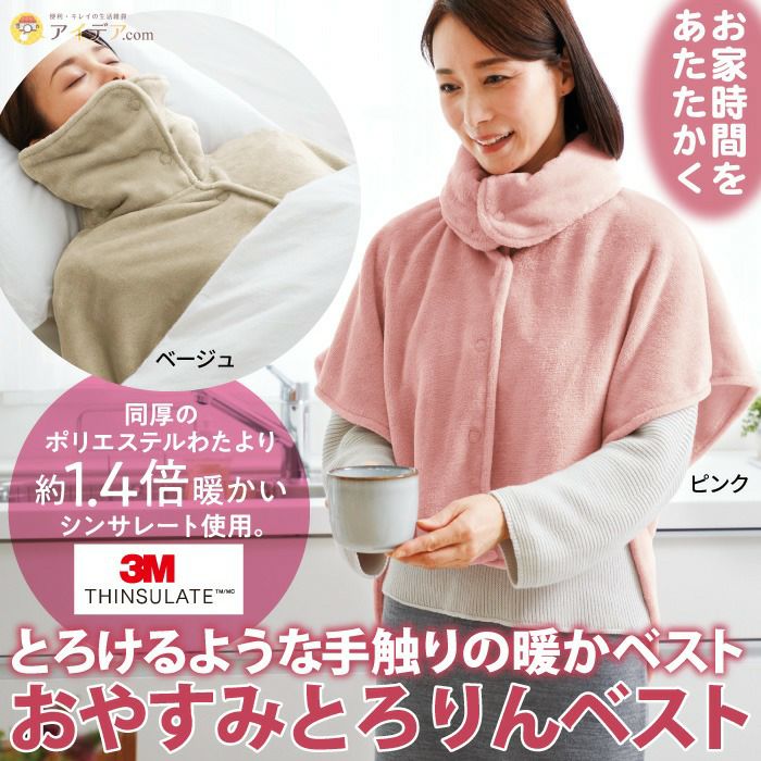 | ボリュームのある襟で首もとからのすきま風を防ぎます おやすみとろりんベスト ![]() 【おやすみとろりんベスト】は、寒いなと思ったときにさっと羽織れる暖かベスト♪ゆったりサイズなので、厚目のパジャマや服を着ていても動きやすい! 首元の襟は、まるでお布団みたいにボリュームがあるので、首元から冷気が入らずとってもあったか。冷えやすい肩や背中も毛布ですっぽりやさしく包まれているようなあたたかさです♪ ![]() ![]() ![]() ![]() ![]() ![]() ![]() ![]() ![]() ![]() 襟の後ろ部分に空気で暖かさをつかまえる機能生地「シンサレート」を使用。同厚のポリエステルわたより約1.4倍もあたたかいんですよ! 首元は羽根布団にくるまれているように温かく、肩や背中もほっこり温めてくれるベストは、起きてる時も寝ている時も大活躍!寒い冬でもこれ1枚あれば快適に過ごせそうです。 電気代0円で暖かく過ごせるからとってもエコですね♪ ![]() |