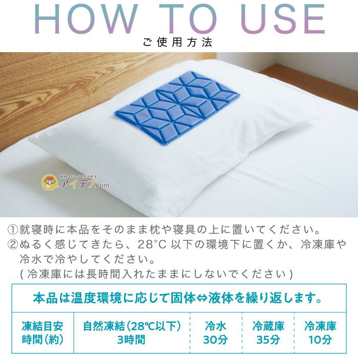 | ■使用上のご注意 | ●本製品は保冷剤ではありません。●50℃以上の場所や湿気の多い場所などに放置したり、50℃以上のお湯に入れたりしないでください。品質・性能が低下する可能性があります。●液体⇔個体を繰り返すため、気泡や凹みなどが現れる場合がございますが、使用上の問題はございません。●長期間の冷凍庫保管は本体の劣化の恐れがありますのでおやめください。●廃棄の際は各自治体の区分に従ってください。万が一、液漏れ等で排水口に流れてしまった場合は大量のお湯を排水口に流してください。●製品を無理に引っ張ったり、過度な荷重をかけたりしないでください。破損する恐れがあります。●破損、変形した場合は、直ちに使用を中止してください。●鋭利な物に触れないように気をつけてください。●万一、内容物が目や皮膚に付着した場合は大量の水で洗い流してください。また、飲み込んでしまった場合は無理に吐き出さずに医師の診断を受けてください。●汚れが付着した場合は、水で洗い流してください。●高温多湿の場所を避け、冷暗所に保管してください。●使用環境または保管環境によってはうまく機能しない場合があります。●お子様の手の届かない所に保管してください。●本来の用途以外には使用しないでください。●使用感には個人差があります。●火気厳禁。 | ||