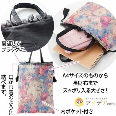 A4サイズのものや、長財布もスッポリ入る大きさ! 口は巾着のように結べます!