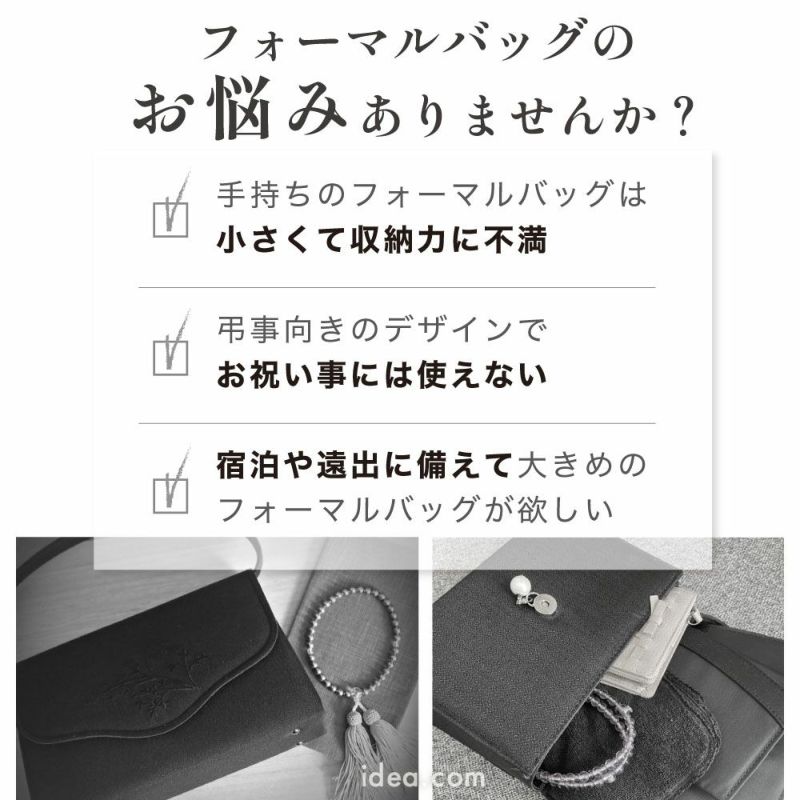 | 必要なものが、全部収まる!サブバッグいらずのセレモニーバッグ たっぷり入るフォーマルバッグ ![]() ![]() ![]() ![]() ![]() ![]() ![]() ![]() ![]() サブバッグいらず。品よく“全部入る”フォーマルバッグ フォーマルシーンでも、必要な荷物を妥協せずしっかり持ち歩きたい。そんな女性の声に応えて誕生したのが【たっぷり入るフォーマルバッグ】です。 A4書類や袱紗、ハンカチ、数珠、ペットボトルまで収納できる大容量サイズながら、見た目は上品でスマート。マチ幅は約12cmとしっかりあり、底面が広いためバッグが自立しやすく、荷物の出し入れもスムーズです。 内側にはペットボトルを固定できるループ付き、オープンポケットも複数装備。小物を整理しやすく、式典や会食などでの所作もエレガントに見せます。さらに、素材にはしっかりとした生地を使用し、ブラックフォーマルらしい落ち着いた艶感で高級感も演出。 結婚式や入学式・卒業式などのお祝いシーンから、お葬式・法要などの弔事まで、幅広く活躍。サブバッグを持たずに一つで完結できるので、荷物が多い日も安心です。 大人の女性の品格を保ちながら、実用性も妥協しない??そんな理想を叶えるフォーマルバッグ。「必要なものが全部入る」この安心感が、あなたの立ち姿をより美しく、堂々と見せてくれます。 |